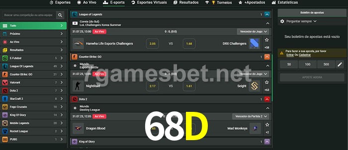 O 68D oferece uma grande seleção de opções de apostas em e-sports com probabilidades competitivas